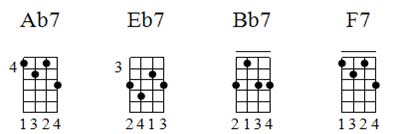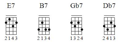 Tivemos o acorde de Eb7 no modelo de D7, o acorde de F#7 no modelo de F7, e o acorde de Bb7 no modelo de A7.