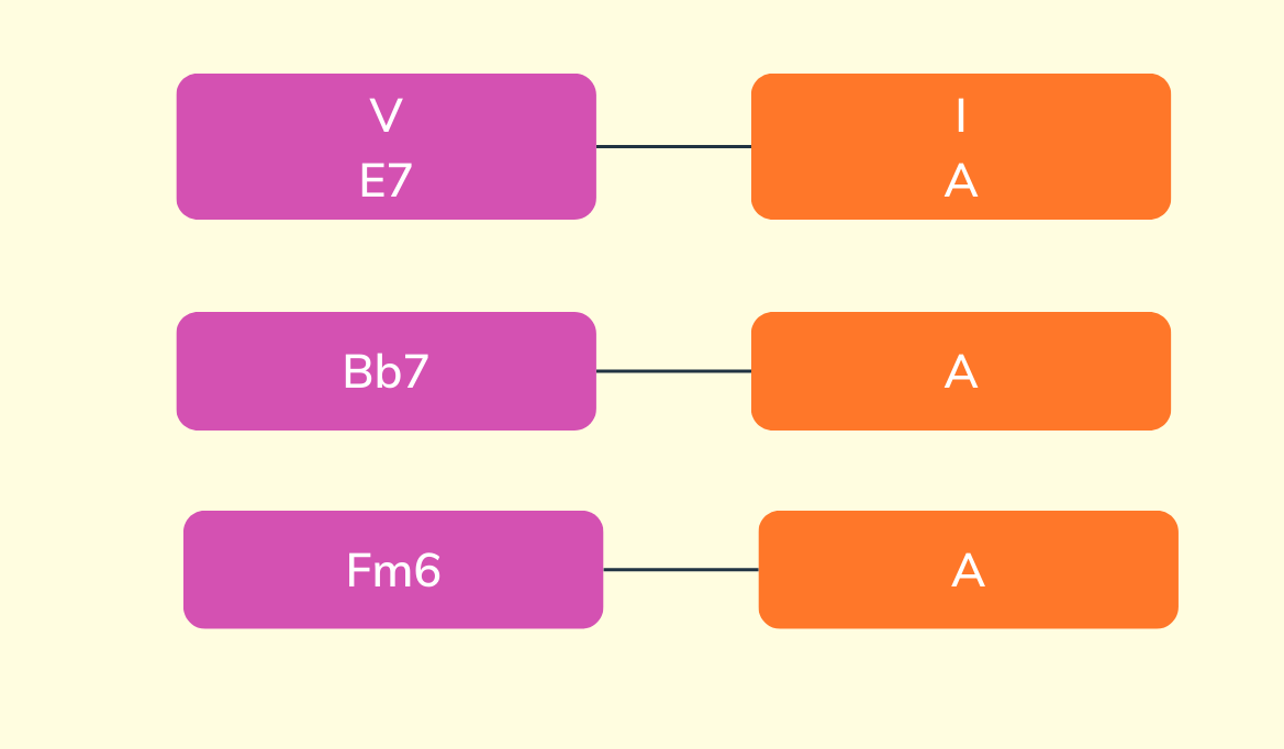 Outra substituição possível é descobrir quem é a quinta do acorde dominante e transformar num acorde menor com 6, por exemplo: Bb7 por Fm6.