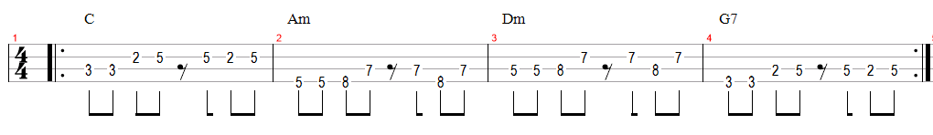 Dessa vez, vamos tocar a mesma sequência de acordes, só que um compasso por acorde.