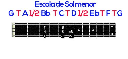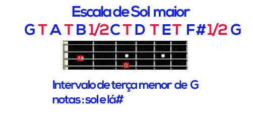 Tocando no instrumento a escala de Gm e os seus intervalos teremos: