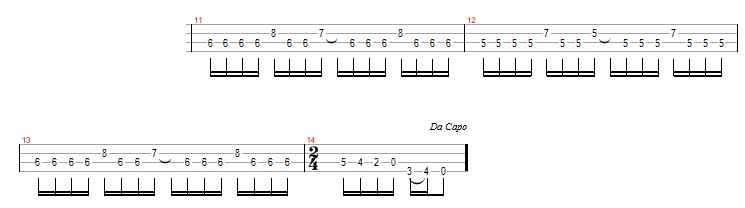 Durante o solo da guitarra, uso no contrabaixo as pentatônicas de Em e Am, para ligar os acordes, bem ao estilo do Roger Glover (Deep Purple).