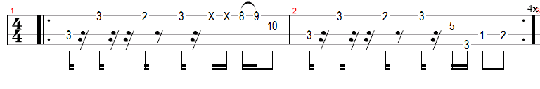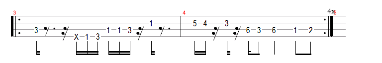 O terceiro exercício pode ser usado tanto no acorde de C7 como no acorde de Cm, novamente temos a valorização da sétima do acorde, e um groove que cria uma linha melódica bem definida. Você encontra esse tipo de levada na canção “Le Freak” do Chic.