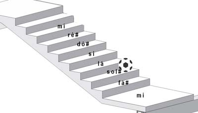 Veja que quando toco a nota mi estou no primeiro degrau da escada. Ao tocar a nota lá estou no quarto degrau da escada e ao tocar a nota si estou no quinto degrau da escada.