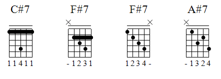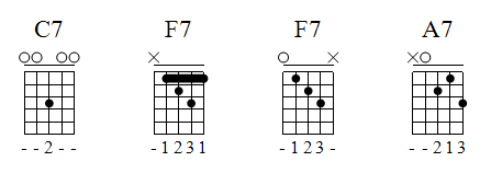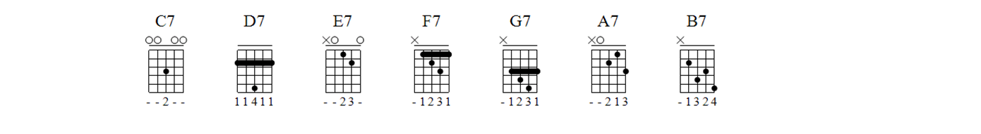 Três formatos de acordes dominantes, basicamente, irão gerar todos os outros acordes dominantes. Serão os acordes de C7, F7 e A7.