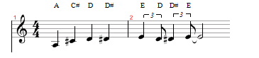 Observe que os acordes seriam A7 e E7. Partindo da nota lá, subimos cromaticamente de dó# até chegar ao acorde de E7.