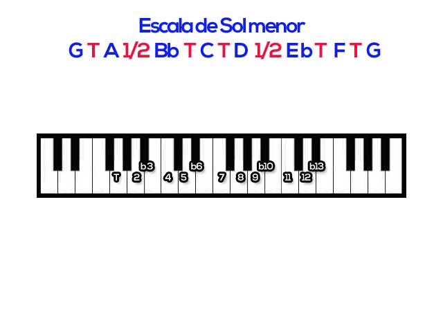 Tocando no instrumento a escala de Gm e os seus intervalos teremos: