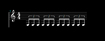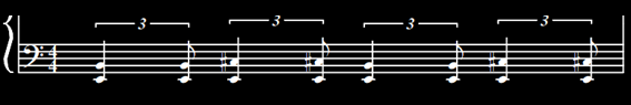 Agora pensando no exemplo 2, onde dividimos 3 notas para cada tempo, vamos fazer com que a primeira nota tenha a mesma duração das duas primeiras notas do exemplo 2. E a segunda nota toca tocará onde era tocada a terceira nota do exemplo 2. Ou seja nós vamos tocar duas notas por tempo. Mas o ritmo será como se eu tivesse 3 notas por tempo. Essa é a diferença.