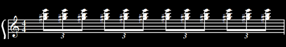 A mão direita será feita no mesmo ritmo do exemplo 2, ou seja 3 notas por tempo.