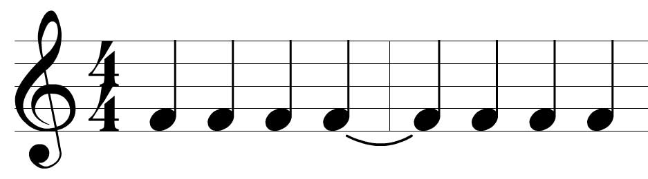 - As ligaduras de prolongamento unem várias notas da mesma altura. Elas são usadas para permitir que a duração da nota se estenda além das barreiras (como a barra de compasso no exemplo acima).
