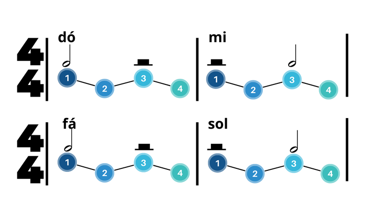 Lembra que o número inferior determina o valor da semibreve? Se o nosso compasso é 4x4, significa que a pausa de semibreve tem duração de quatro tempos.